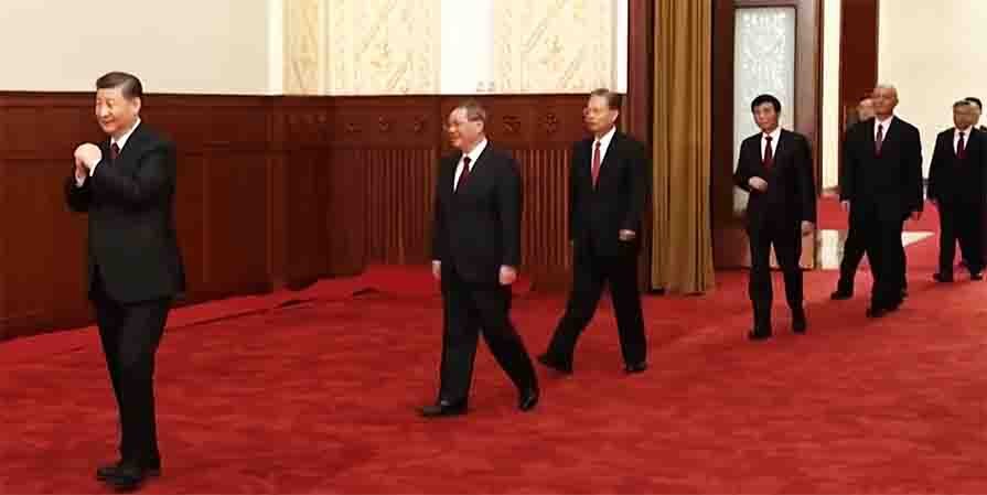 15 November 2012, the collective leadership of the 18th Central Committee of the CPC made its first public appearance. After Xi Jinping appeared alone on the side screen for five seconds, the other members of the team appeared one by one. Before taking the podium, the other members always kept a distance of about 2 metres from Xi Jinping.